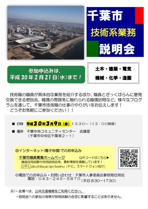 千葉市広報広聴課 Auf Twitter 職員採用説明会 技術系 3月9日 金 には千葉中央コミュニティセンターで技術系業務説明会を開催します 技術職 土木 建築 電気 機械 化学 造園 での受験を希望される方は 是非こちらもご参加ください 事前申込制です 詳細は