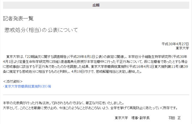 东京大学学术造假门 撤销分子生物学一教授43篇论文