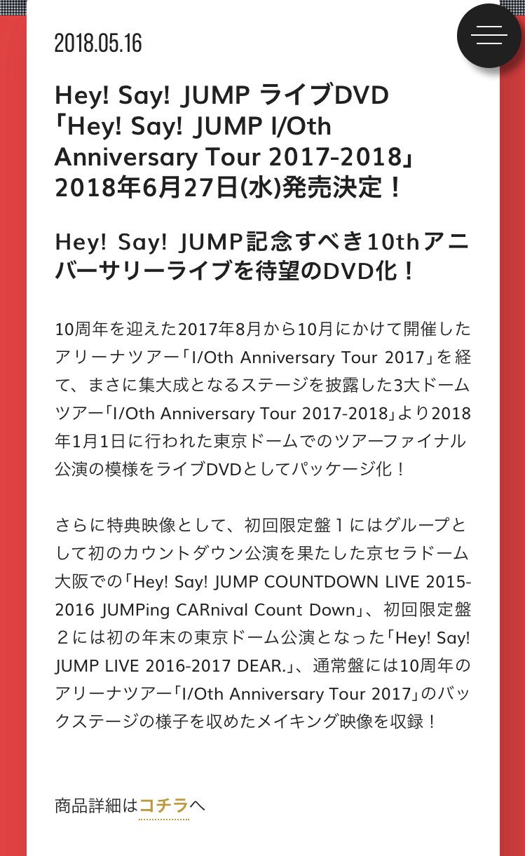 ゆとたんぽことみ A Twitter 京セラ単独カウコンも映像化 やっと映像化になって嬉しい Dvd Hey Say Jump I Oth Anniversary Tour 2017 2018 6月27日 水 発売決定 特典映像として初回限定盤1にはグループとして初のカウントダウン公演を果たした京セラドーム